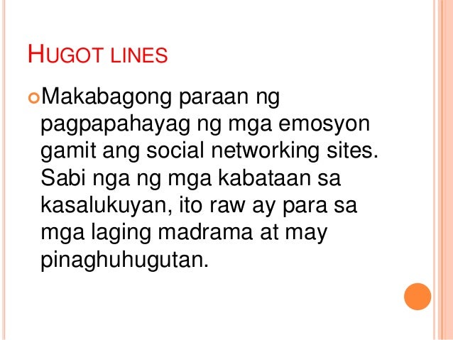 1622019 In this article we have compiled for you several hugot lines and write-ups that contain Tagalog hugot lines. Hindi mo to matatanggal sa isang bata. 1 Mag tweet upang ibigay ang inyong perspektibo opinyon at saloobin ukol sa from FILIPINO 11 at University of the Philippines Diliman.